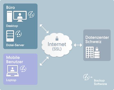 Mal, wenn auf einem solchen Computer eine Verbindung zum Internet hergestellt wird, werden die zu schützenden Daten automatisch durch die Backup Pro Software an das Datenzenter von