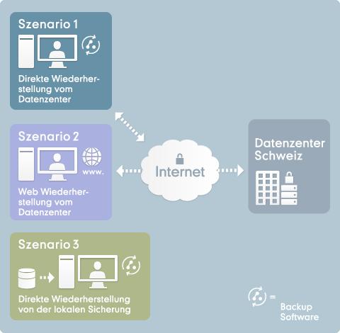 Mit Backup Pro können Sie Ihre Daten über den Backup Pro-Client (Szenario 1) oder eine einfach zu verwendende Web basierende Benutzerschnittstelle (Szenario 2) wiederherstellen. Backup Pro bietet darüber hinaus die Möglichkeit, Ihre Daten mithilfe eines lokalen Cache (Szenario 3) wiederherzustellen.